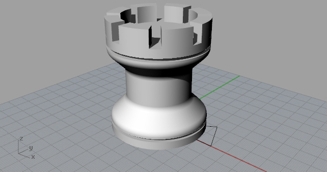 Using the Boolean Intersection command, I can create a single block on the top of the rook. Notice it is curved on the outside (and inside), making it flush with the surface below it.