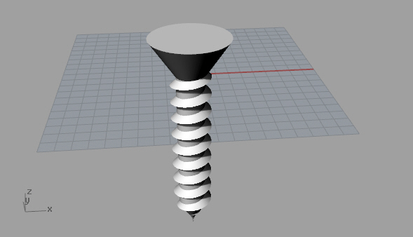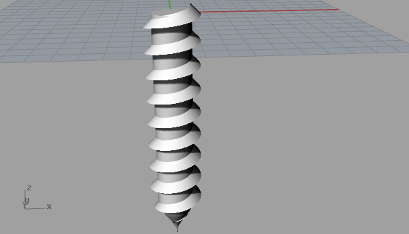 I could use the tapered helix line as a rail to sweep the threads around the screw's shaft using the Sweep1 command. I remembered to Cap the threads when I was done. I also modeled the threads to overlap the cylinder because Rhino doesn't seem to like coincident surfaces when using boolean operations.