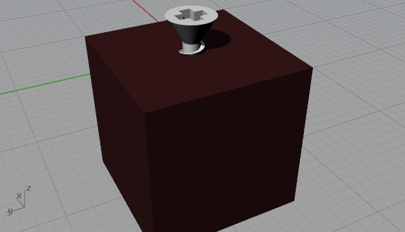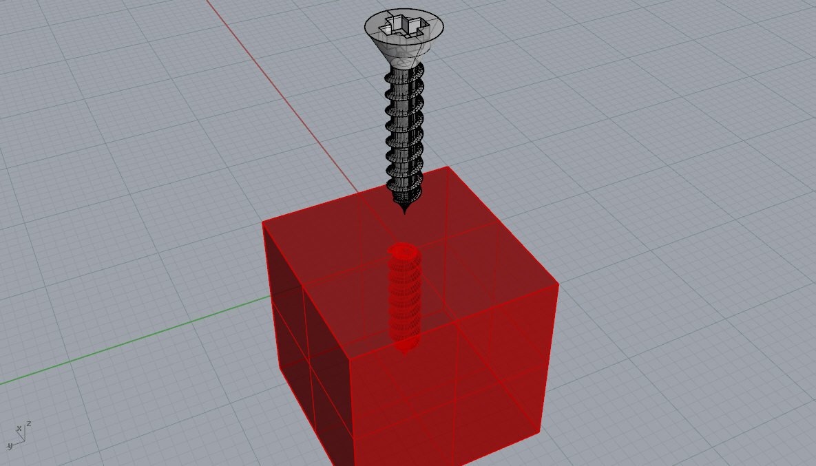 Getting the boolean operations to work for this object was a non-trivial matter. Rhino's Boolean Difference command didn't like operating on the screw's threads. I kept getting an error message indicating that the boolean operation failed. I don't understand what the problem was. The Check command tells me the "Rhino polysurface object is valid." The thread's object type is a "closed polysurface." The Volume command gives me a volume.