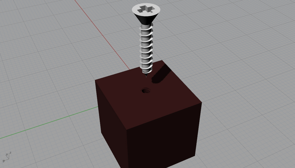 Our assignment was to make two things that fit together, so I need to insert the screw into something. I made a simple block of wood and used boolean operations to make a hole for the screw.