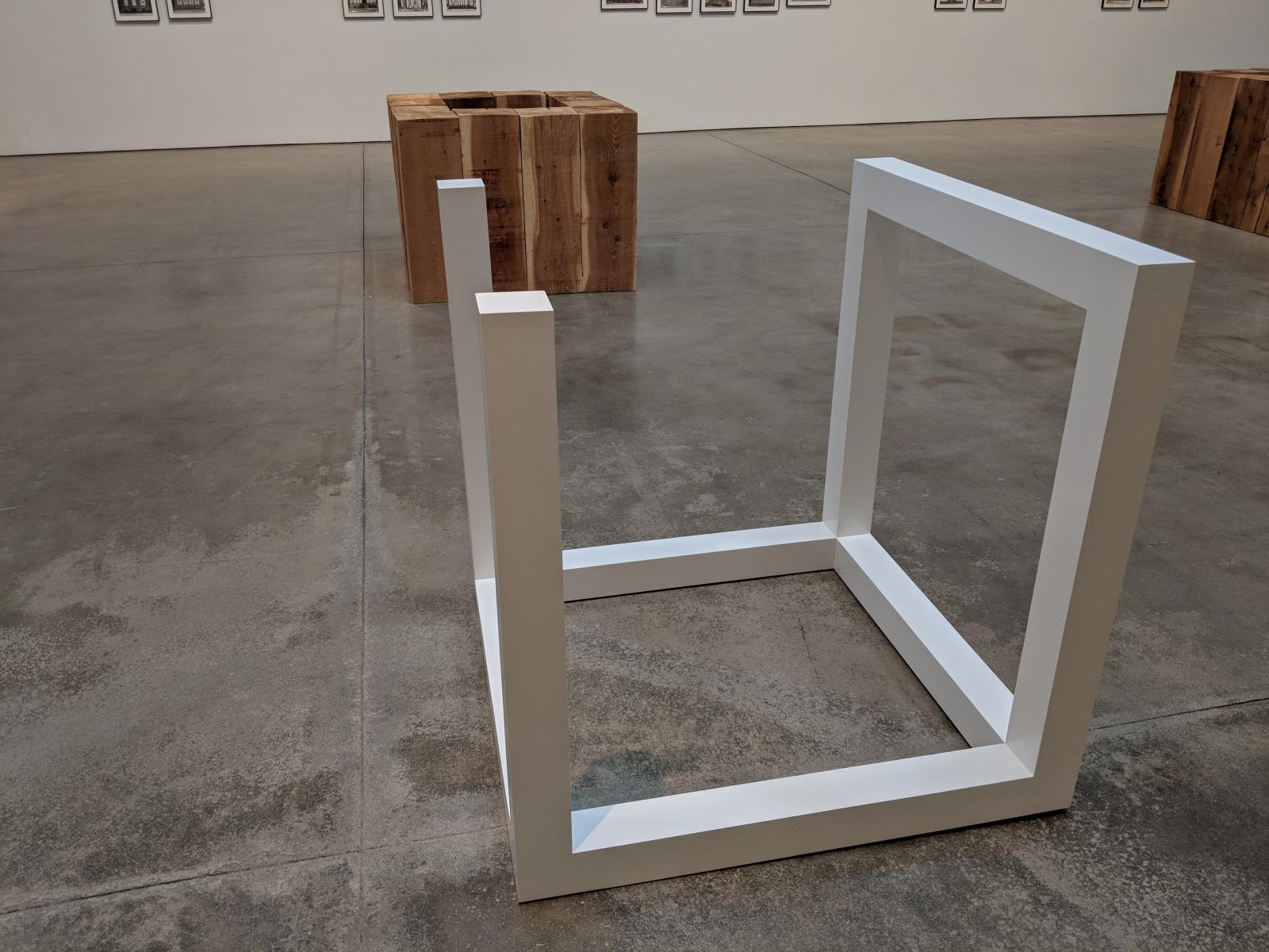 This new way of seeing resonated with the art world and attracted LeWitt and Andre to the Bechers’ work. While viewing Andre’s series Hollow Square (2008) my attention was directed to the identically cut square pieces of lumber material and their arrangement in a square, revealing a hollow space inside. This positioning compelled me to contemplate the wood material in a way that eliminates the distraction of a more complex form. Also on display were a few structures from LeWitt’s series Incomplete Open Cubes (1974). LeWitt wanted us to think about a cube and all the possible permutations of incomplete cubes. He said of the work that when “you look at it, it becomes chaos” but when “you see it in other lines of sight it becomes orderly again.”[6] This arrangement provides us with a new way of seeing and thinking about the cubic form.