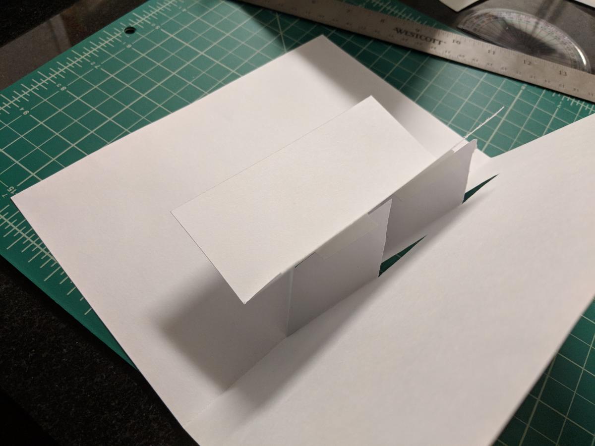 It took a few tries to get it to work. My first few attempts used a mountain fold for the floating paper, which is clearly incorrect. I carefully measured everything with a ruler and protractor and cut the paper with an exacto knife. I don't think it would have worked very well if I had been less precise with my cutting and folding.