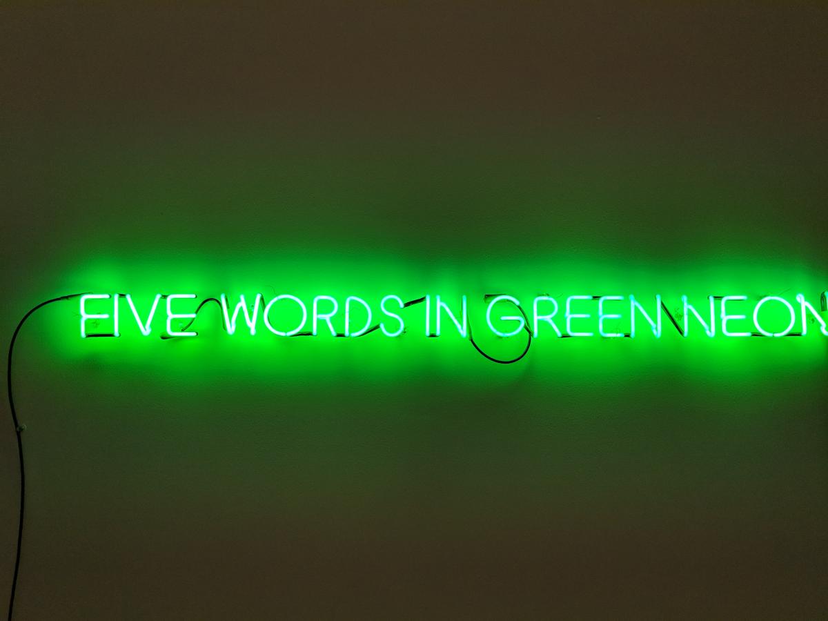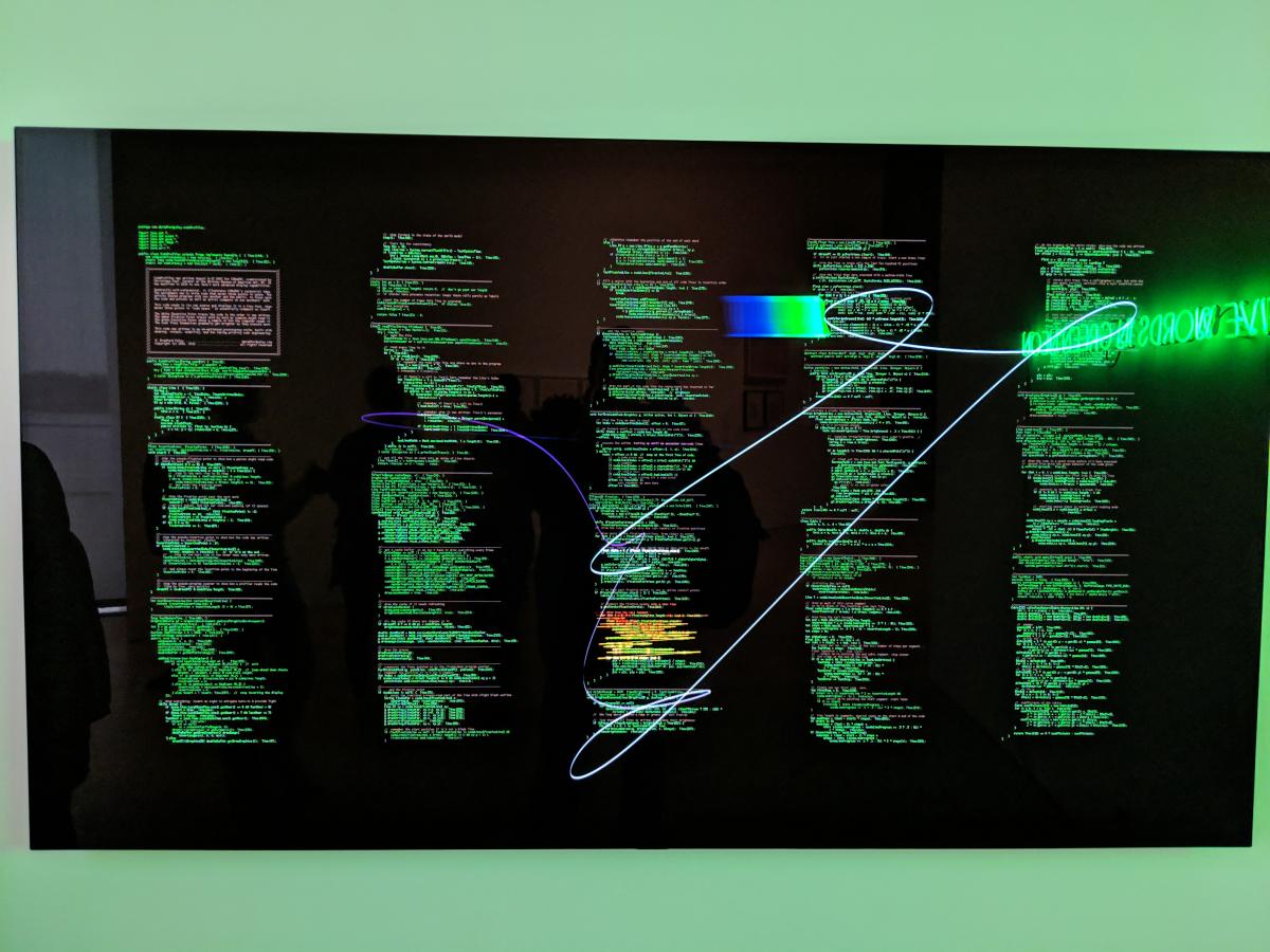 W Bradford Paley’s CodeProfiles (2002 and 2018) is contrasted with Joseph Kosuth’s Five Words in Green Neon (1965). Recognizing the relationship between the two works took a few moments for me to figure out. I began with CodeProfiles, and since I could read the computer code, I first read the code without looking at the work’s placard. I quickly realized the code I was reading was being executed on the screen in front of me and that the program was designed to analyze its own code. In the computer science world this is called reflection. Then I looked at Five Words in Green Neon and realized that it was also self-referencing. The Whitney curators put these two works together because they both refer back to themselves. Although it might have been a small thing I was both pleased and encouraged that I figured that out on my own.