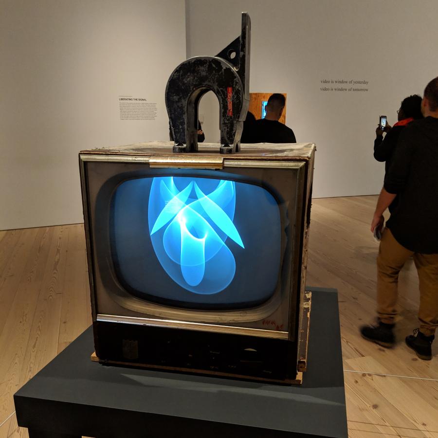 The work that meant the most to me is Nam June Paik’s Magnet TV. After researching 70’s video art last semester I can appreciate the significance of this and other similar works by Paik. Paik would experiment with televisions by tampering with their internal electronics and altering their normal function. One such device designed to do this is the Wobbulator, built with collaborator Shuya Abe. With both works Paik is challenges a relationship with television built around passive consumption of broadcast programming and encourages us to see the device as something that can be modified and controlled.