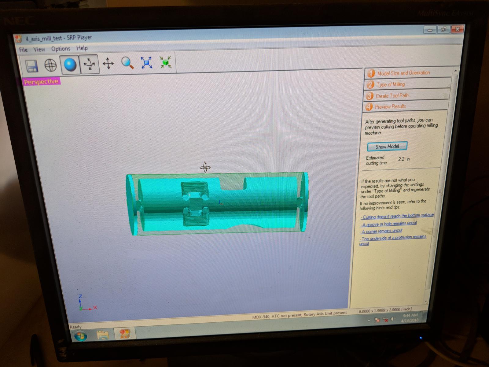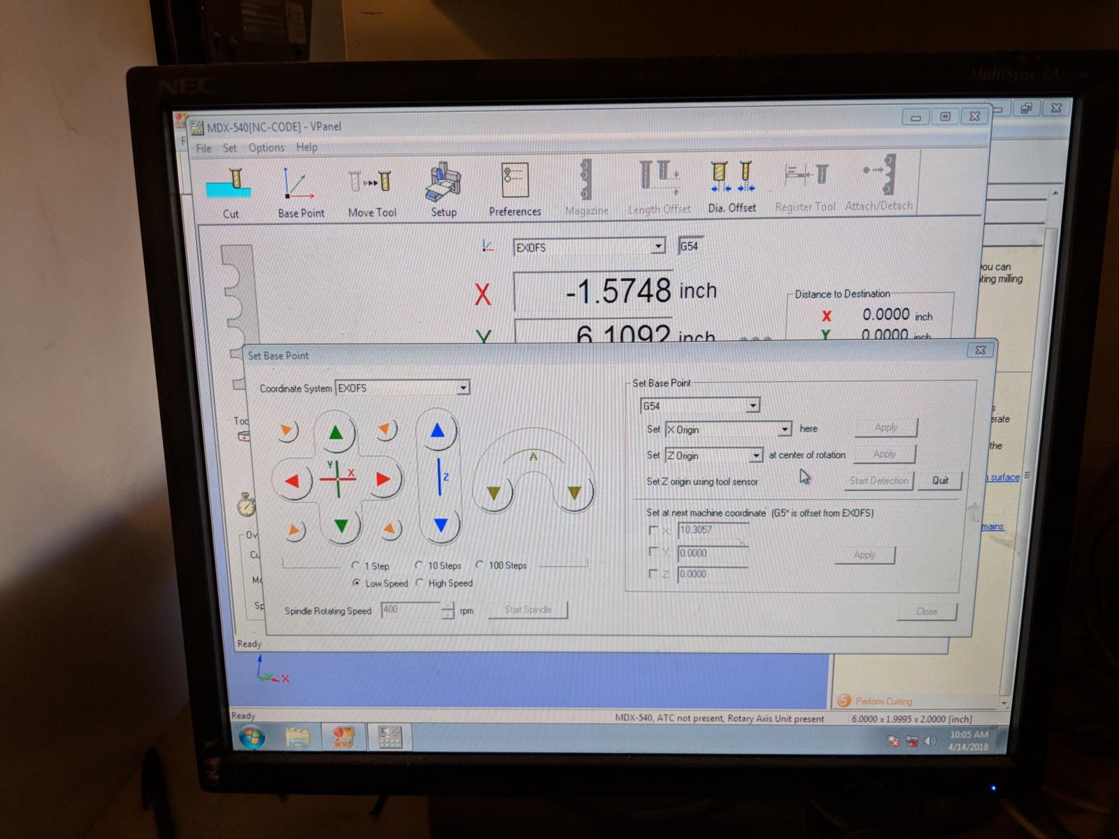 The job is configured to be a round job, not a flat job. It quickly became apparent that the machine would only mill by rotating the wood and moving the bit along the X and Z axes. The bit is always pointed directly at the center of the wood.