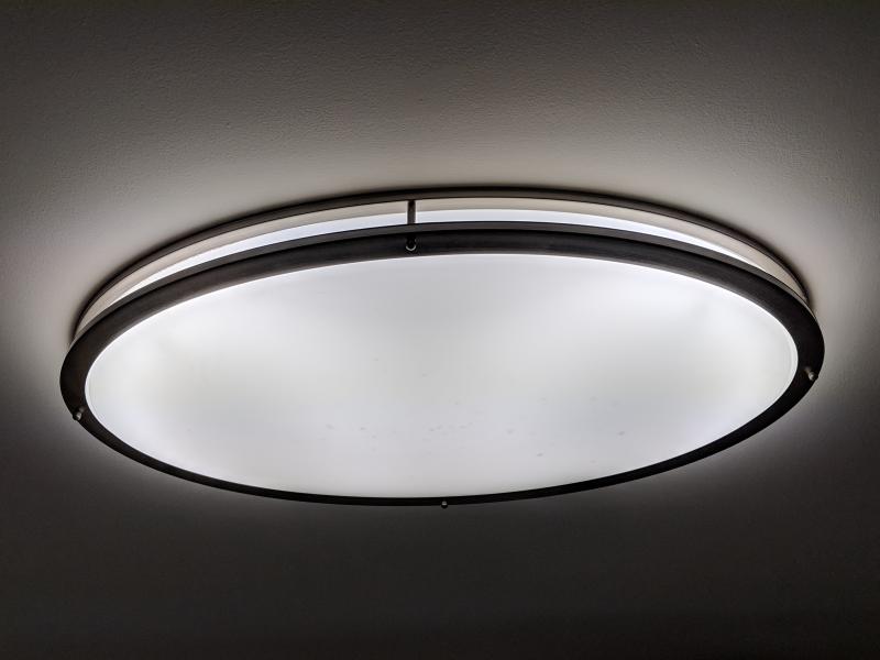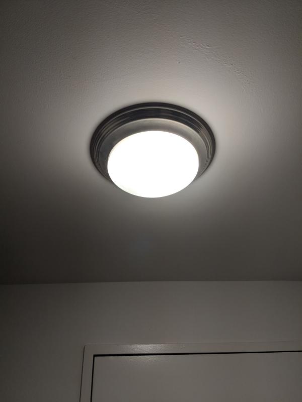 The second light source is what I believe to be a LED light with plastic cover on the ceiling near my front door. For this light I measured the illumination of the ceiling around the outside of the lamp about 6-12 inches away. The previous ceiling illumination of 70 lx was reduced to 8 lx.