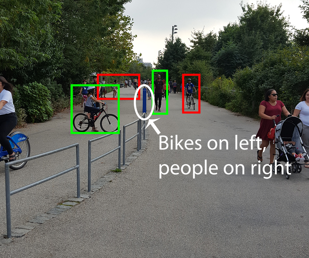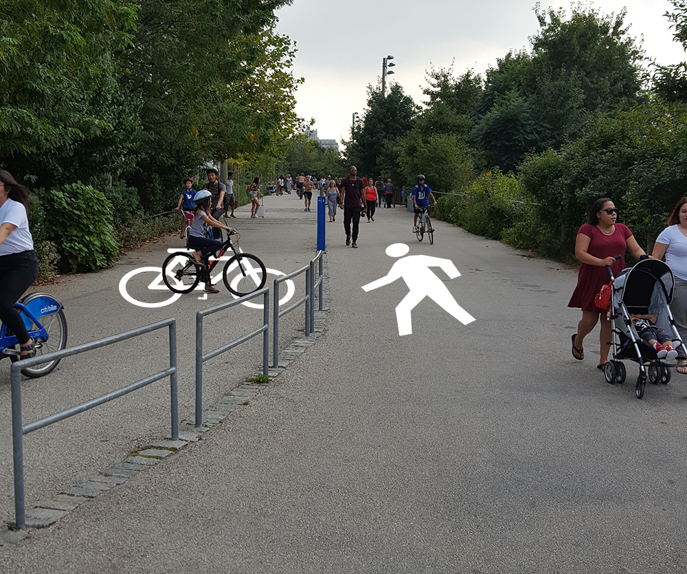 My first thought of poor signage is in Brooklyn Bridge Park. I live in the area and do volunteering there on a regular basis. In the park there is a path running through the entire area that is open to bicycles and pedestrians. Here is an example:
