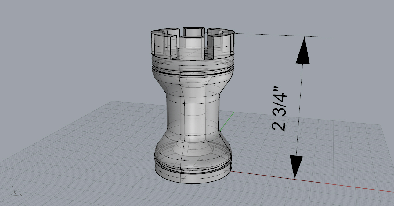 The crenellated rook looked fatter than what I had in mind so I used the Scale2D command to make it thinner. I also added a Linear Dimension annotation in inches to demonstrate that it would fit in a 3 inch cube.