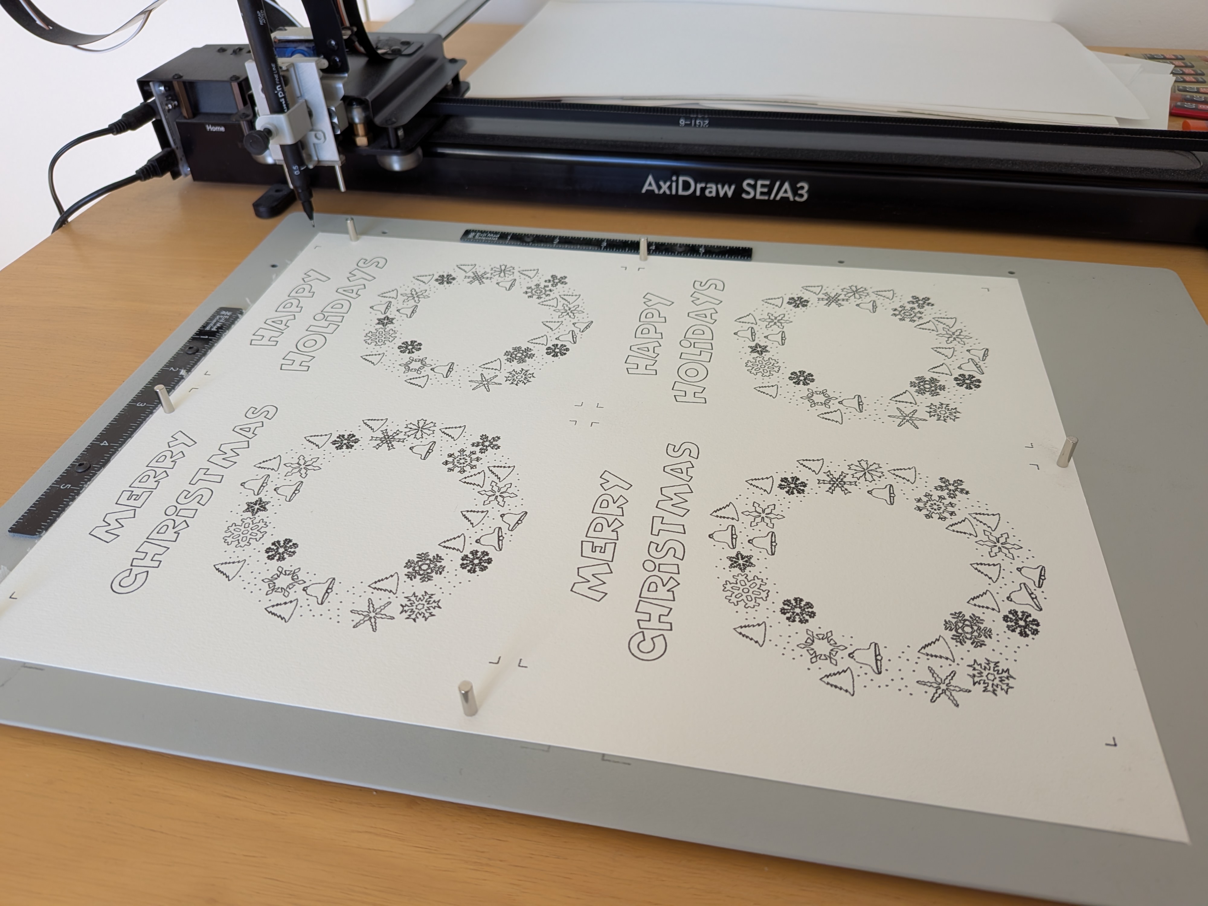 As I did for 2023, 2022 and 2021, I used my Axidraw to create my holiday cards. This year, I also added some water colors to the designs, partly because the idea of combining pen plotting with water colors has been on my mind for a while, and partly because I thought these cards needed some color to be complete.